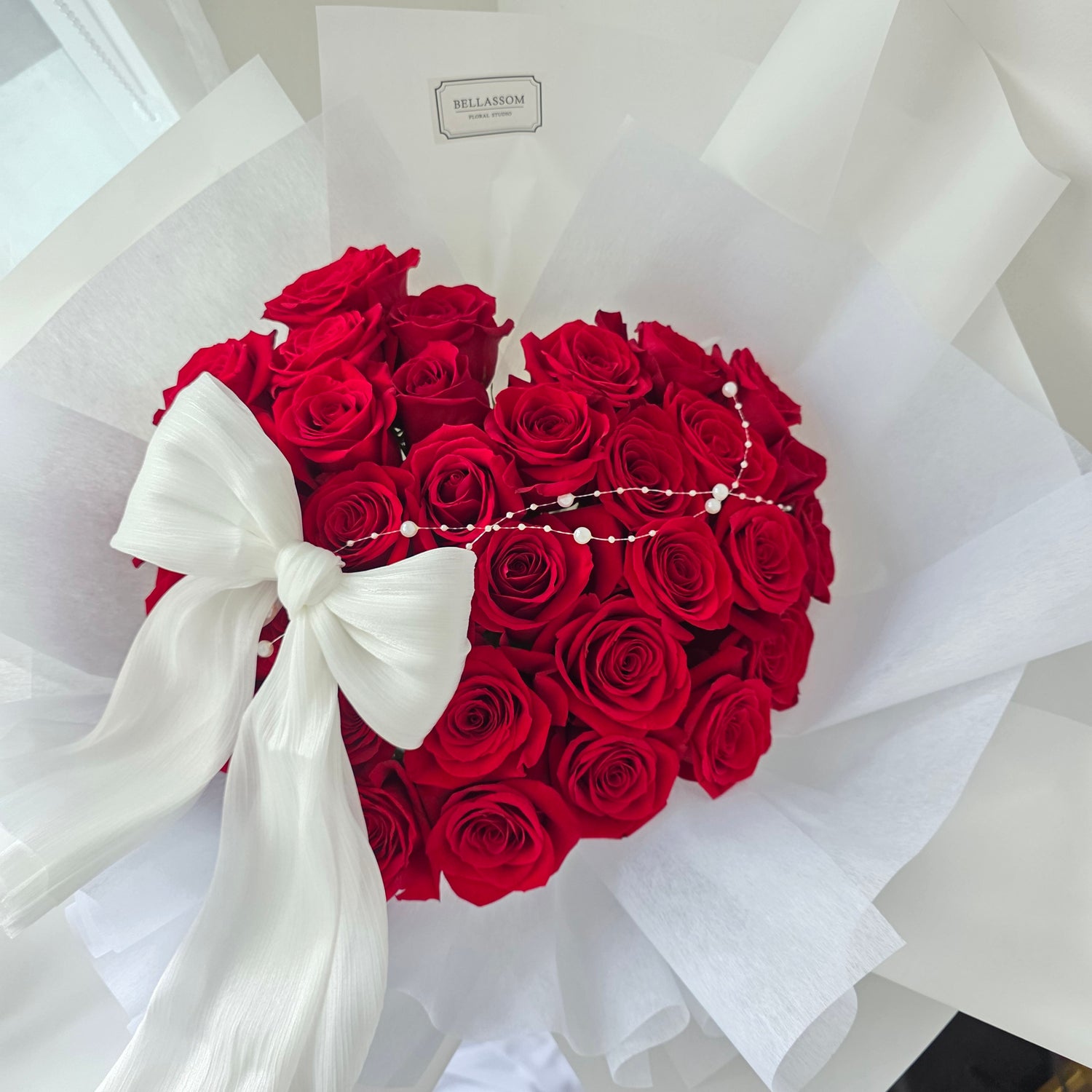 Make a grand romantic statement with Bellassom’s Luxury Heart Bouquet, available in 24 or 33 premium red roses. Each bouquet is expertly arranged in a glamorous heart shape, finished with a delicate pearl string, and wrapped in our signature Korean luxury style for a refined and unforgettable presentation.